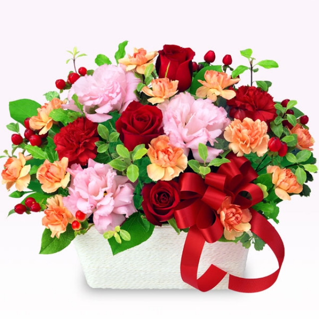 ミックスの色合いの横長のアレンジメント(カゴ付)です。 ※お届け地域や季節により、お花の種類・カゴなどが変わる場合がございます。