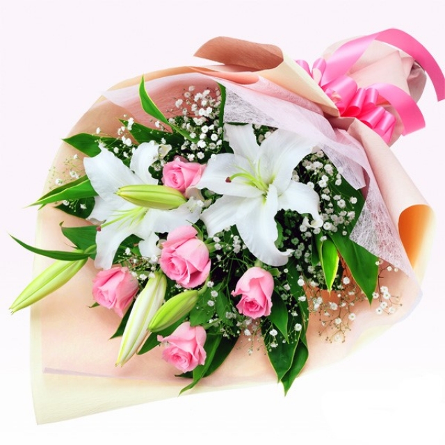 ユリ・バラ・かすみ草の花束です。 ※お届け地域や季節により、バラの花の濃淡・ラッピングなどが変わる場合がございます。