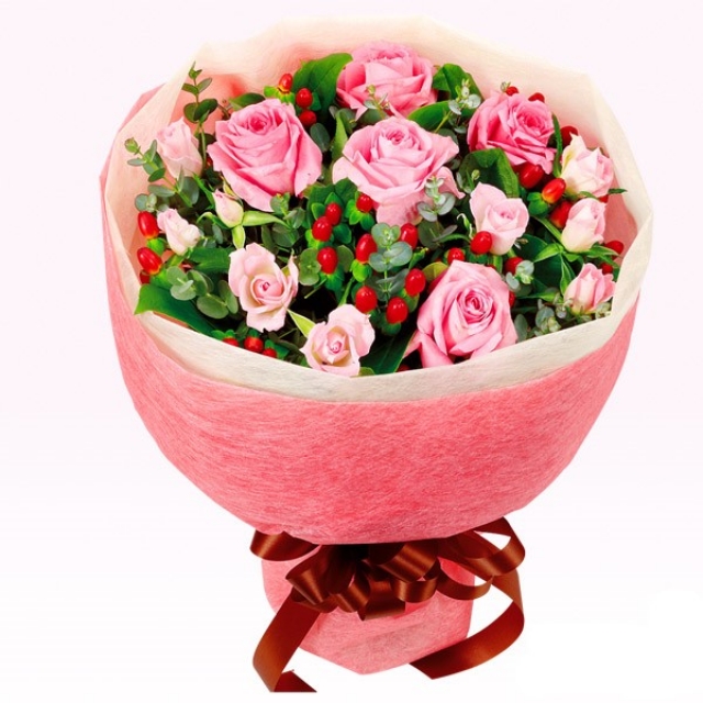 ピンク系のお花が中心のブーケ風花束です。 ※お届け地域や季節により、お花の種類・ラッピングなどが変わる場合がございます。