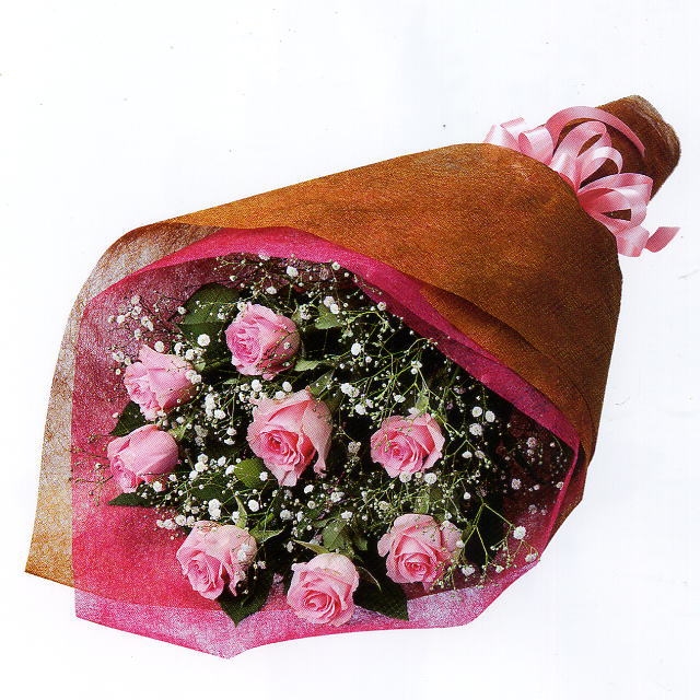 ピンクバラとかすみ草の花束です。 ※お届け地域や季節により、バラの花の色の濃淡・ラッピングなどが変わる場合がございます。