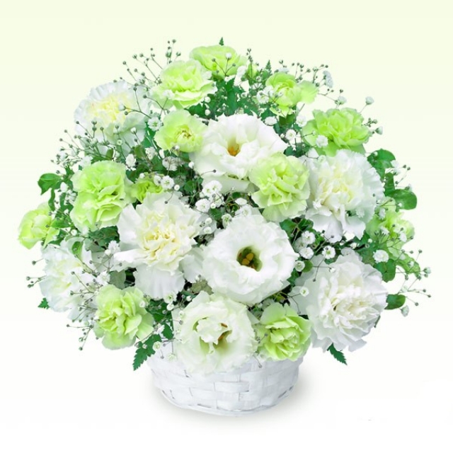 白とグリーンのお花のアレンジメント(カゴ付)です。 ※お届け地域や季節により、お花の種類、カゴなどが変わる場合がございます。