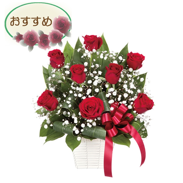 赤バラとかすみ草のアレンジメント(カゴ付)です。 ※お届け地域や季節により、お花の種類・カゴなどが変わる場合がございます。