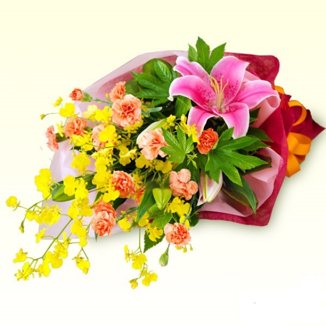 ユリやオンシジュームなど明るい色合いの花束です。 ※お届け地域や季節により、お花の種類・ラッピングなどが変わる場合がございます。
