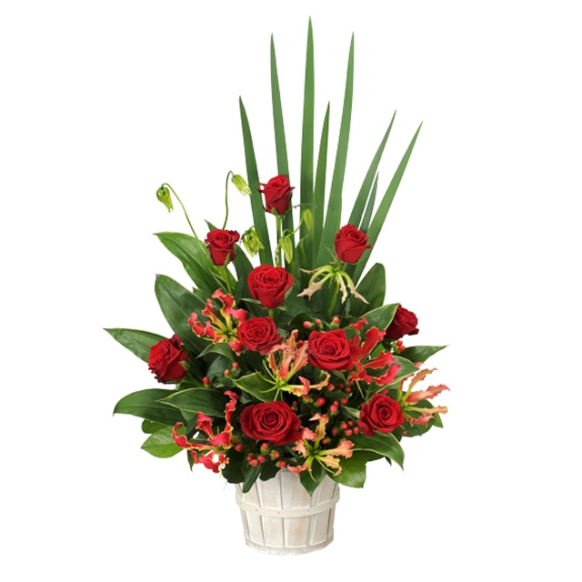 赤系のお花を中心としたアレンジメント(カゴ付)です ※お届け地域や季節により、お花の種類・カゴなどが変わる場合がございます。