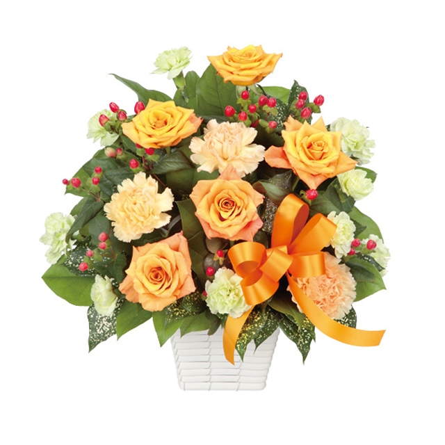 オレンジバラのアレンジメント(カゴ付)です。 ※お届け地域や季節により、お花の種類・カゴなどが変わる場合がございます。