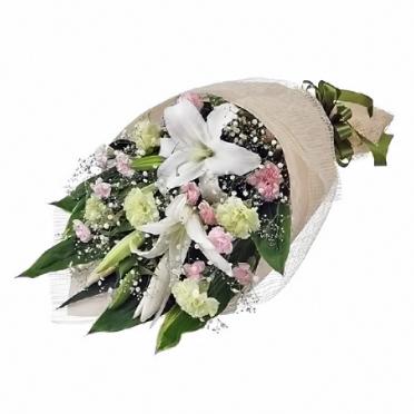 白系のお花が中心で、淡い色のお花が入ったお供え用花束です。