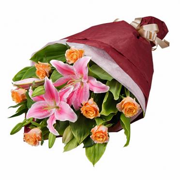 オレンジバラとピンクユリの花束です。