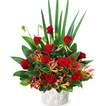 赤系のお花を中心としたアレンジメント(カゴ付)です。