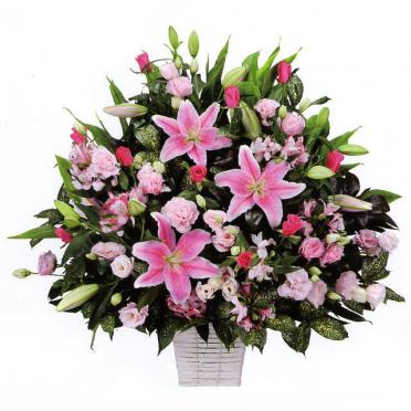 ピンク系のお花を中心としたアレンジメント(カゴ付)です。