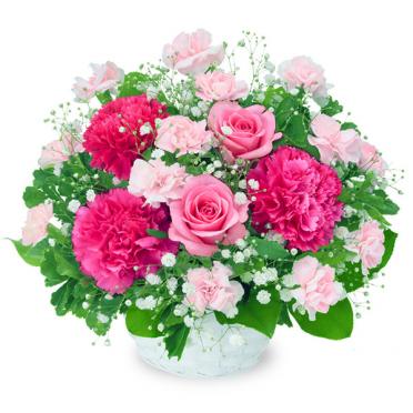 ピンク系のお花が中心のアレンジメント(カゴ付き)です。