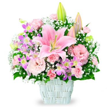 ピンク系のお花が中心のアレンジメント(カゴ付)です。