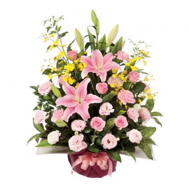 ピンク系のお花を中心としたアレンジメント(カゴ付)です。