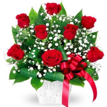 赤バラとかすみ草のシックなアレンジメント(カゴ付)です。
