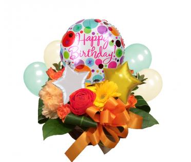 バルーンが入ったフラワーアレンジメント(カゴ付)です。