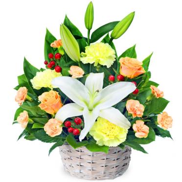 黄色・オレンジ系のお花が中心のアレンジメント(カゴ付き)です。