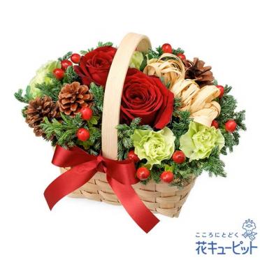 赤系のお花が中心のアレンジメント(カゴ付き)です。