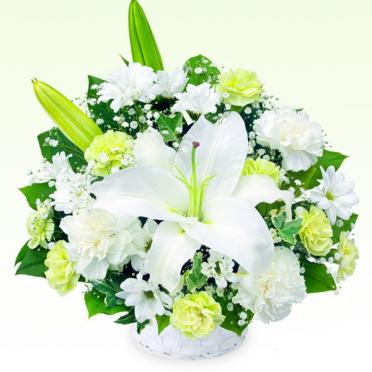洋花のみで、白中心に落ち着いた色を入れたアレンジメント(カゴ付)です。