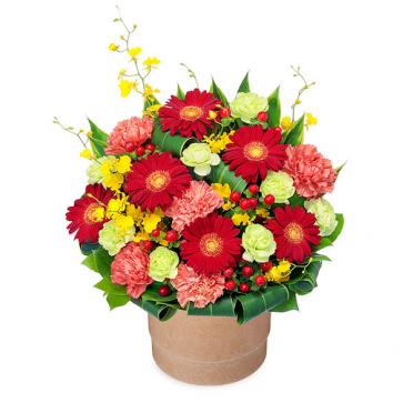 赤・黄色系のお花が中心のアレンジメント。