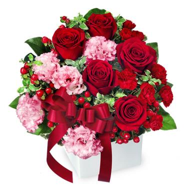 赤バラとリボンのキューブアレンジメント。