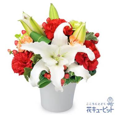 赤・白(紅白)の色合いのアレンジメント(カゴ付き)です。