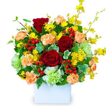 赤バラの華やかアレンジメント(カゴ付き)です。