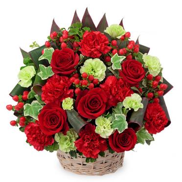 赤の花々をバスケットにたっぷりと生けたアレンジメントです。
